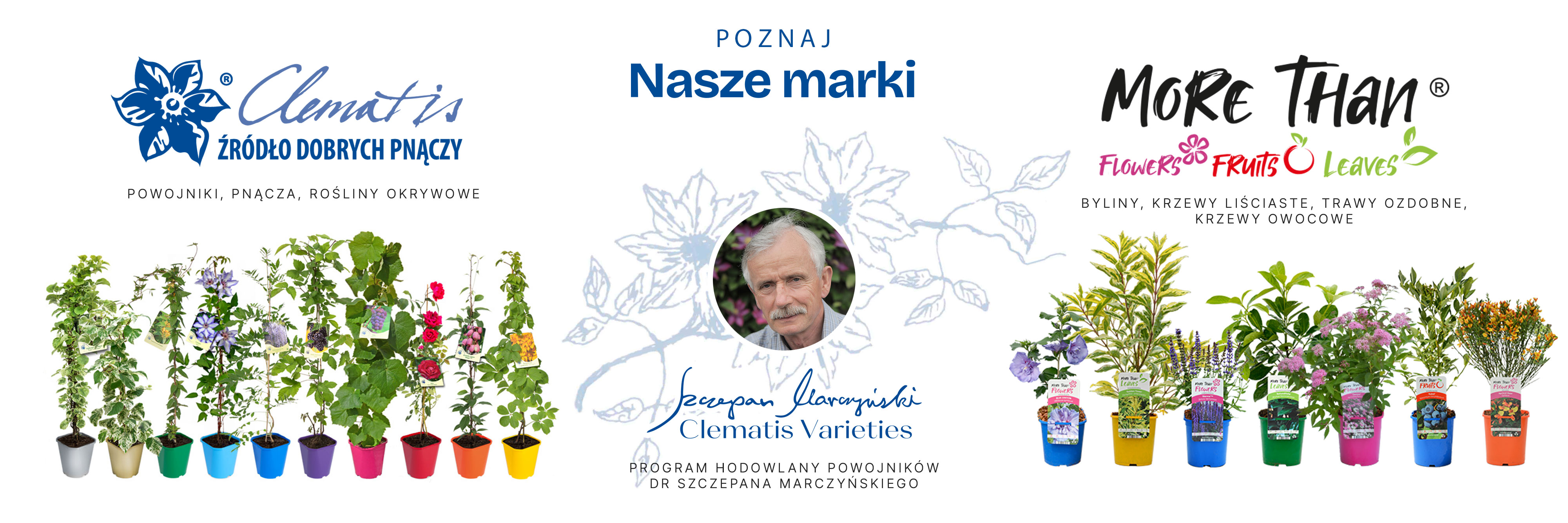 to najwyższej jakości powojniki i inne pnącza ogrodowe oraz wybrane rośliny owocowe i niskie rośliny okrywowe. Podstawę naszej produkcji stanowią rośliny w pojemnikach C2. Asortyment jest stale poszerzany o nowe, wartościowe pnącza.
