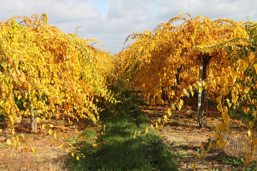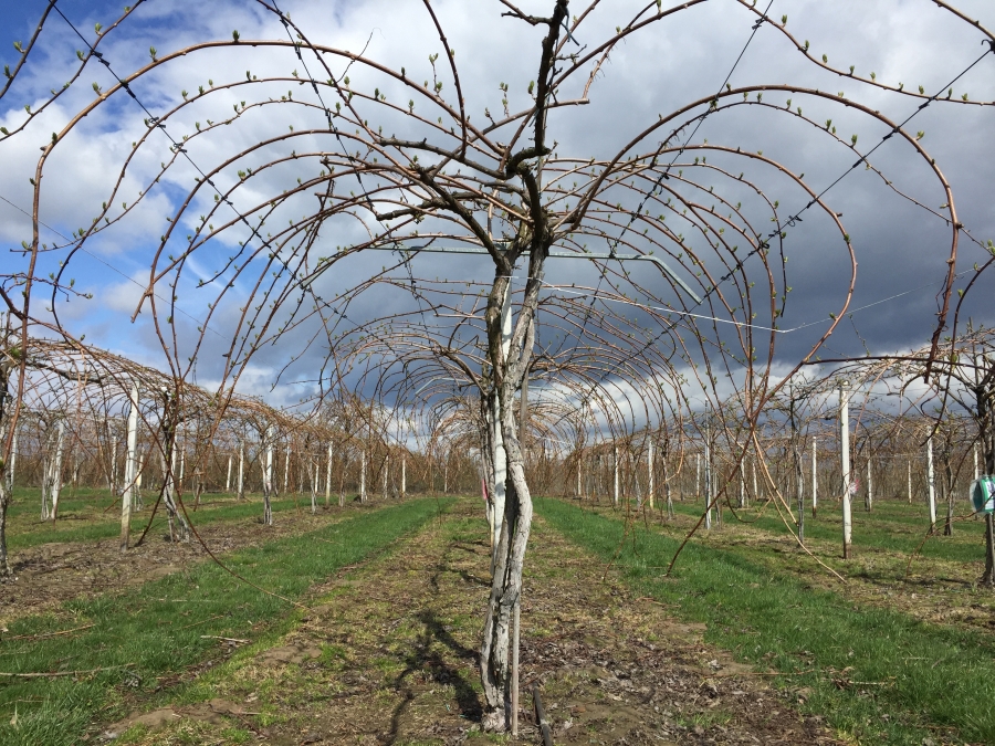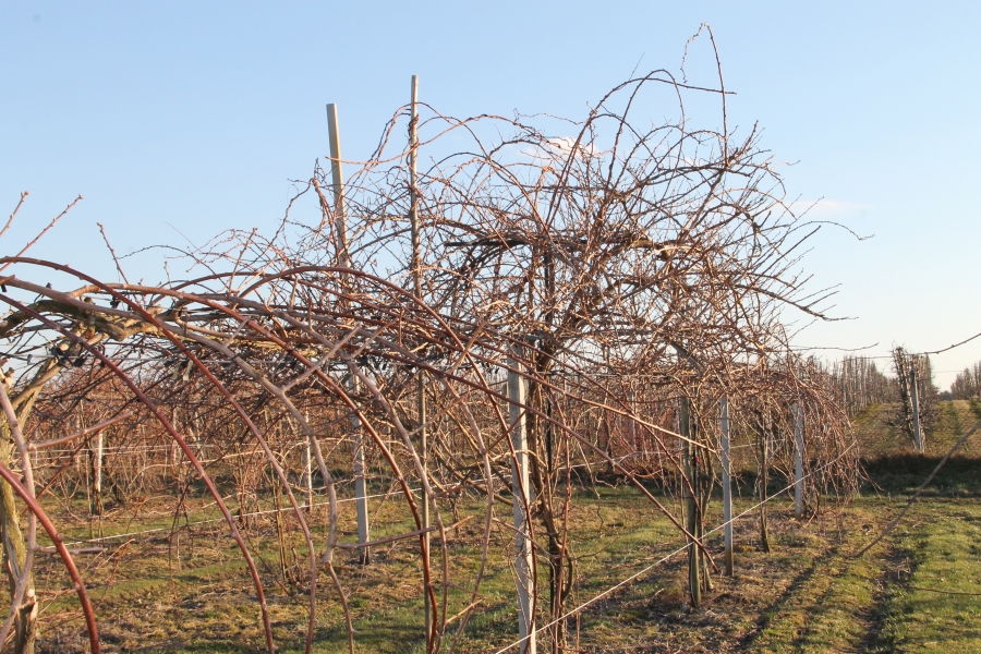 Rolą krzewów męskich na plantacji MiniKiwi jest dostarczenie możliwie dużej ilości pyłku dobrej jakości. Ponieważ krzewy nie rodzą owoców nie ma konieczności rokrocznego wymieniania pędów. Można im też pozwolić rosnąć nieco bardziej swobodnie (Fot. 4).