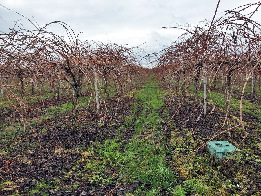 Zasada cięcia „na owocowanie” (plonotwórczego) jest podobna bez względu na sposób prowadzenia krzewów. Jednak na plantacjach towarowych większość roślin prowadzona jest przy podporach w kształcie litery T. Zimowe cięcie dojrzałych roślin żeńskich tak prowadzonych polega na usuwaniu starszych pędów owocujących wyrastających z głównych ramion (kordonów) i zastępowanie ich pędami jednorocznymi, które wyrosły w ostatnim sezonie. Wykonując cięcie zimowe należy pamiętać, że owoce zawiązują się na latoroślach wyrastających z zeszłorocznych pędów. Pędy wyrastające ze starszego drewna bardzo rzadko od razu owocują. Młode pędy wyrastające z pąków, które były silnie ocienione w poprzednim sezonie są mniej produktywne od tych, które były w pełni nasłonecznione. Idealny pęd zeszłoroczny jest niezbyt gruby (ok. 10 mm u nasady), ma dość krótkie międzywęźla, dobrze wykształcone pąki i jest dobrze zdrewniały. Najlepiej gdy pędy takie wyrastają jak najbliżej centralnego drutu. Przystępując do cięcia zimowego w pierwszej kolejności należy rozplątać poskręcane nawzajem pędy i usunąć poskręcane i drobne, potem starsze – owocujące w mijającym sezonie. To niełatwa praca szczególnie, że krzewy bardzo często są mocno rozrośnięte i mają splątane pędy (Fot. 2.).